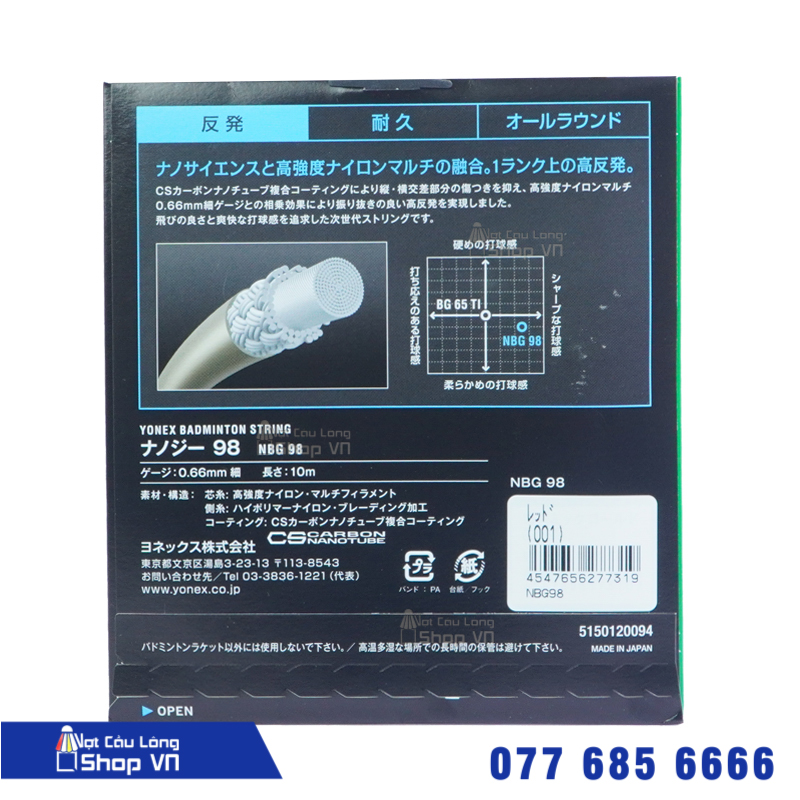 Không cóNếu bạn đang muốn tìm một bộ dây cước trợ lực tốt thì Vợt Cầu Lông Shop xin giới thiệu đến bạn sản phẩm dây cước căng vợt Yonex Nanogy 98 JP. Một sản phẩm cước trợ lực cao cấp dành cho các vận động viên bán chuyên và chuyên nghiệp. Đây là một trong những loại cước đáng mua nhất năm 2020 vừa qua. Một số tính năng dưới đây sẽ cho bạn biết rõ hơn về sản phẩm này.
